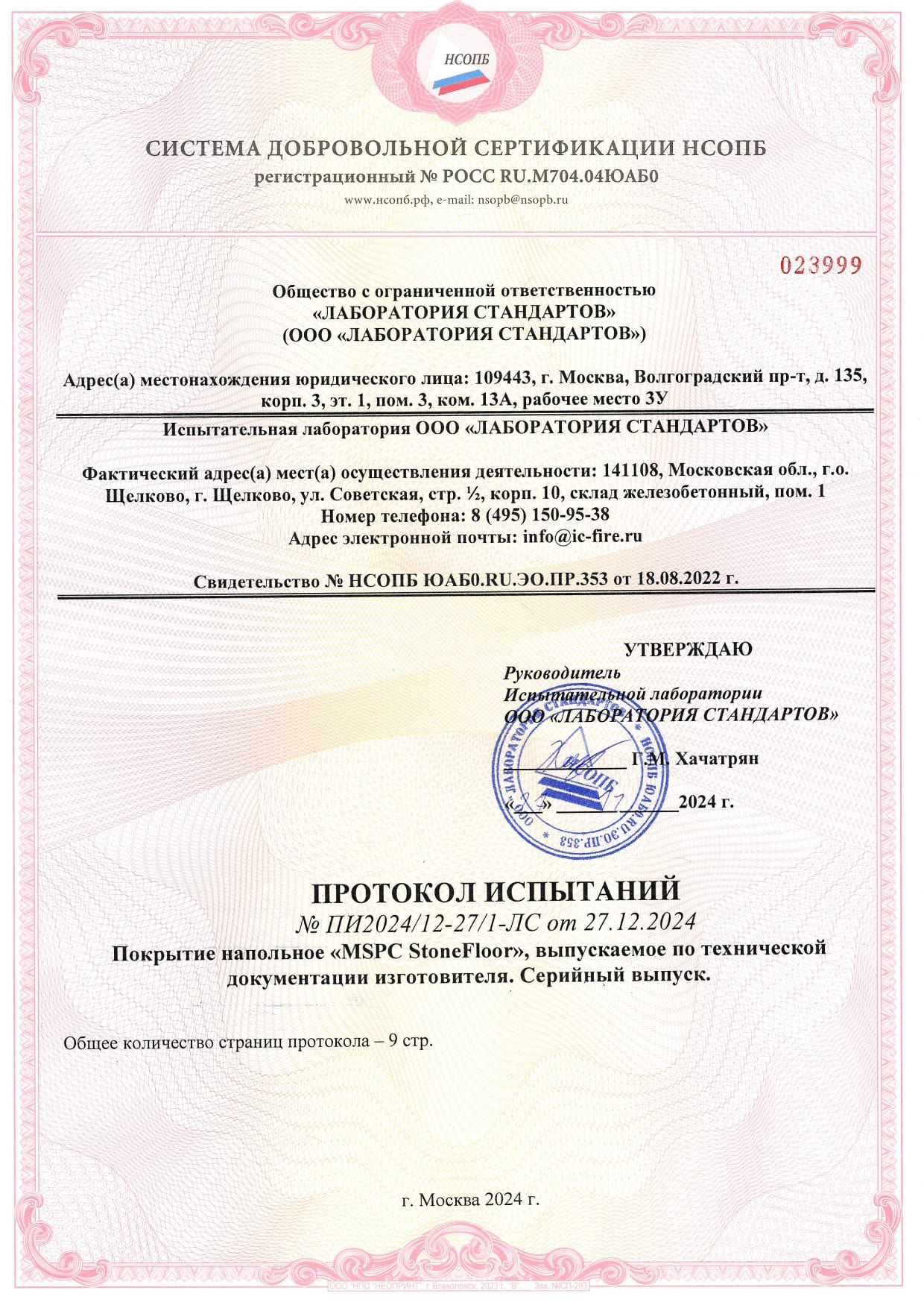 Ниже вы найдете протоколы испытаний MSPC продукции Stone Floor в ПДФ формате, а также добровольный сертификат с синей печатью организации, которая провела реальные испытания.