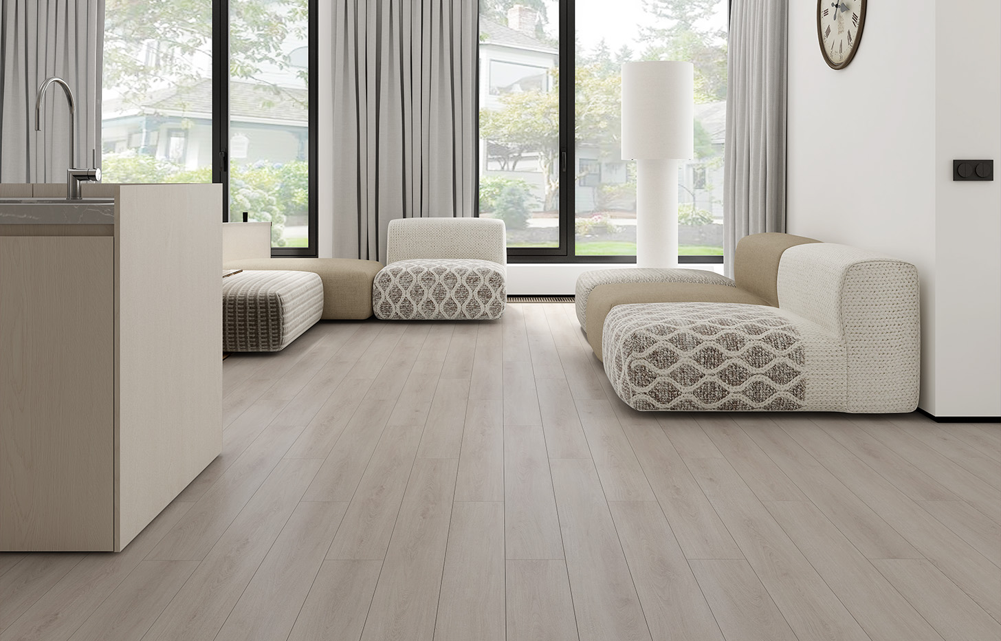 MSPC ламинат Дуб Корнерфилд от Stone Floor — настоящий шедевр. Это декор, который сочетает в себе пятьдесят оттенков серого и пятьдесят оттенков бежевого. Удивительно изящный и удивительно атмосферный, Дуб Корнерфилд станет идеальной основой для интерьера, в котором сочетается эклектика теплых и холодных оттенков. Именно он будет способен объединить холодный синий и бежевый, апельсиновый и серо-зеленый. Добавьте к удивительному цвету Дуба Корнерфилд элегантную 4-стороннюю фаску, medium формат доски и синхронное тиснение и у вас не останется никаких сомнений в верности вашего выбора.